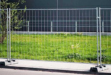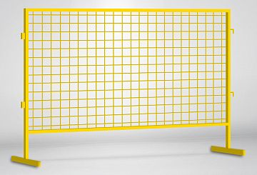 Непостоянные ограды в виде металлических секций состоят из опоры и рамки с натянутой сварной сеткой. Рама и опора выполнены из профтрубы сечением 20 или 25 мм. По обеим сторонам секции приварены зацепы и проушины, с помощью которых элементы ограды фиксируют между собой. Замковое соединение позволяет прочно крепить секции друг к другу.